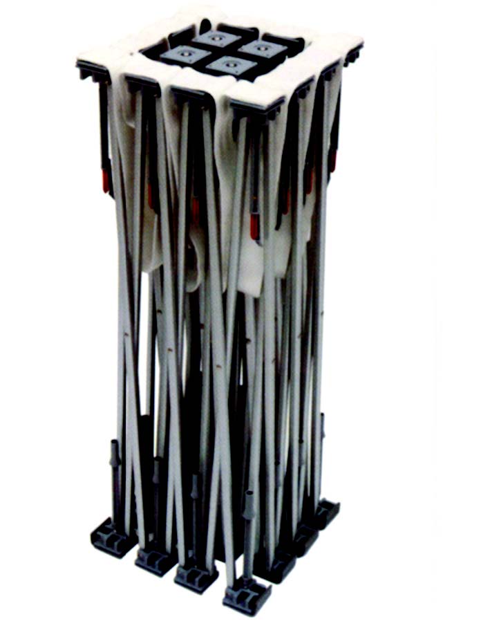 • Struttura modulare richiudibile a ragno, realizzata in alluminio, per il tensionamento di grafiche stampate in tessuto.