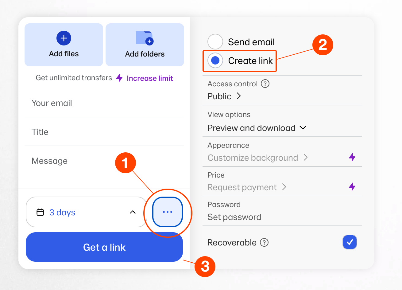 Clicca sul pulsante “Get a link”: il caricamento del file avrà inizio (numero 3 nell’immagine sottostante).