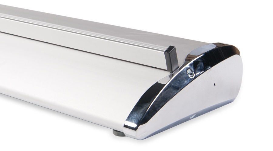 Roll-up elegante monofacciale e intercambiabile, con finali cromati e sacca per il trasporto